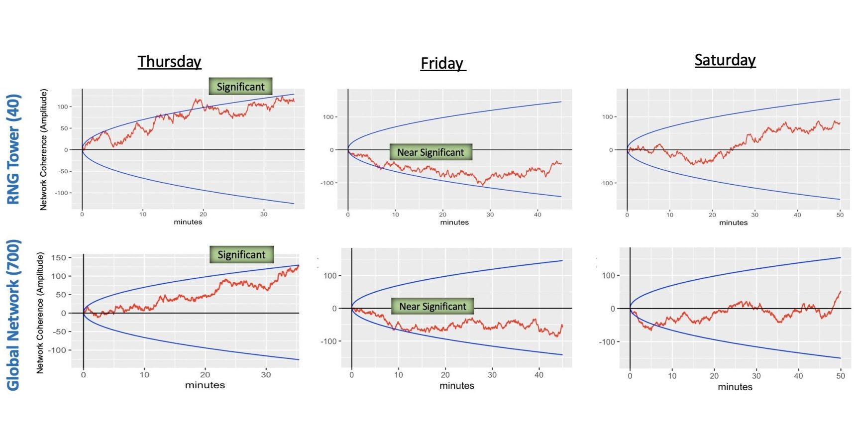 Et uavhengig prosjekt (siden 1998) med et globalt nettverk av random number generators (RNG) måler om store emosjonelle eller fokuserte hendelser påvirker tilfeldige systemer. Under store globale meditasjonsarrangementer (og nylig under Dr. Joe Dispenzas «Coherence Healing»-økter med 1 000–2 200 deltakere) viser RNG-ene signifikante synkroniseringer – både lokalt og globalt. Dette tolkes som tegn på at kollektiv fokus kan påvirke det fysiske feltet på avstand.