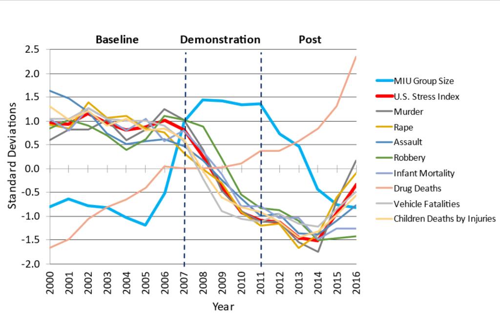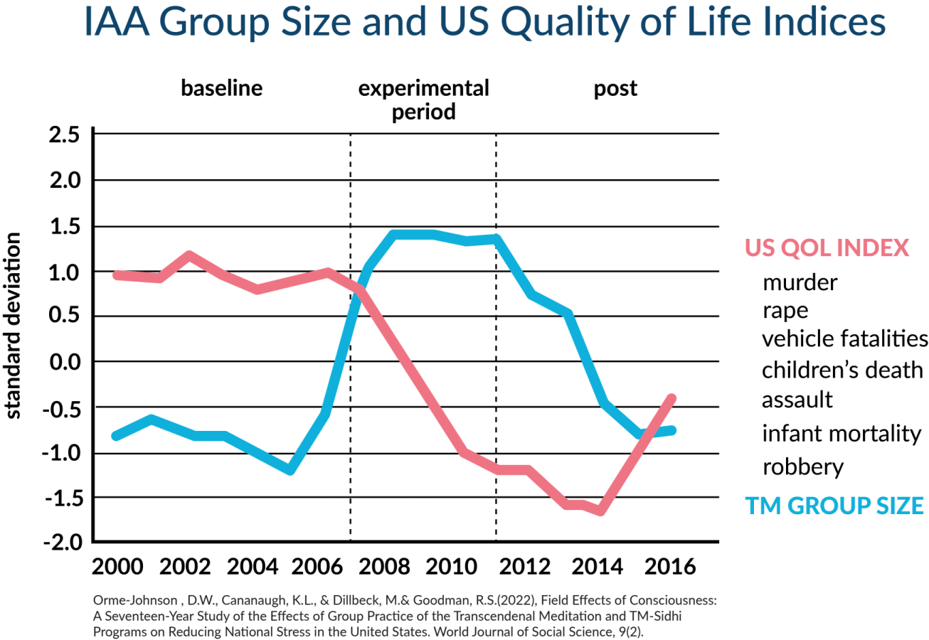- 17-års studie av USA (2000–2016, publisert 2022 i World Journal of Social Science): Den lengste og mest omfattende. Når meditasjonsgruppen nådde og holdt terskelen (2007–2011), falt 8 nasjonale stressindikatorer samtidig (drap, voldtekt, ran, barnedødsfall, narkodødsfall, trafikkdødsfall m.m.). Da gruppen krympet igjen, steg alle indikatorene. Tusenvis av negative hendelser ble avverget årlig.